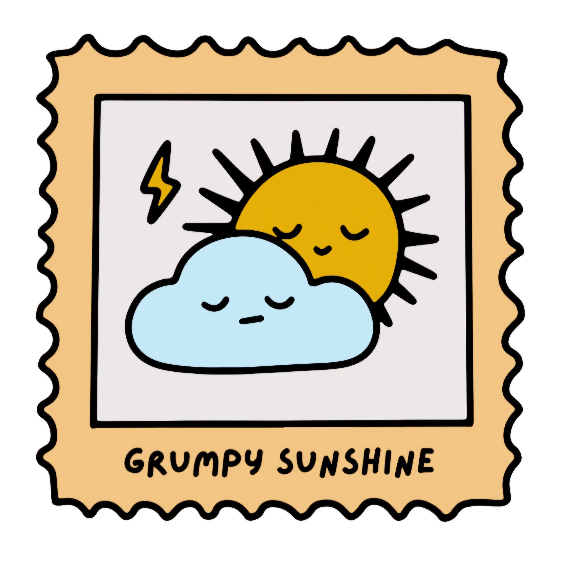 Grumpy Sunshine sticker. Cut out in the shape of a stamp.
