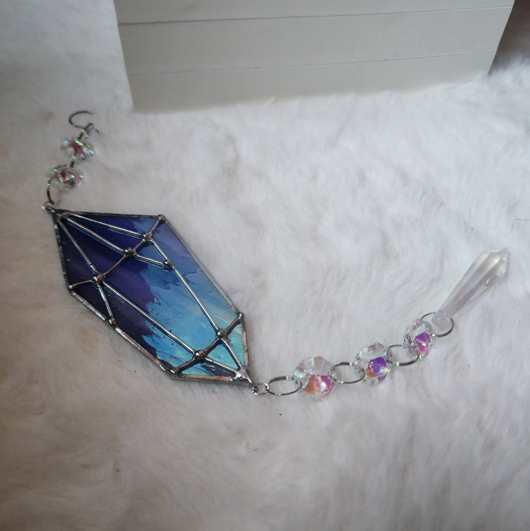 Made by Warrior Goddess Glass using Blue Iridescent Cathedral glass and colorful rainbow maker gems to create little rainbows all over the room beautiful when the sun shines through it!