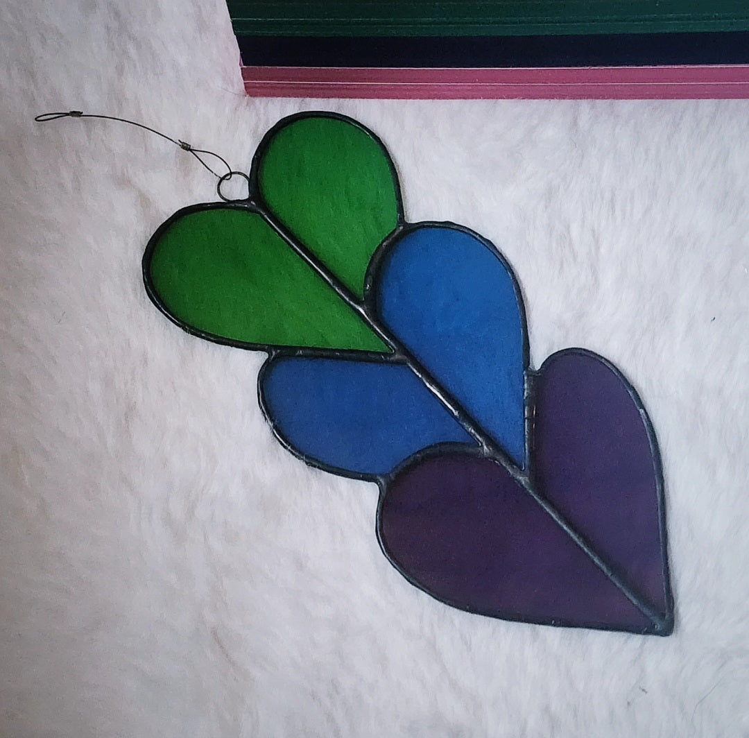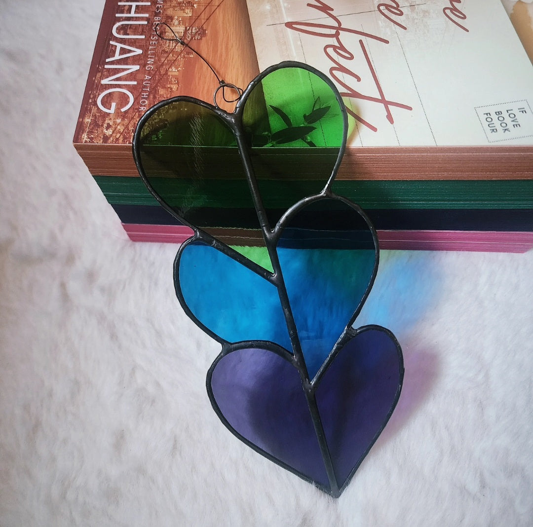 Made by Warrior Goddess Glass using cool colored (green, blue, and purple) water glass that creates wavy heart refractions when the sun shines through it!
