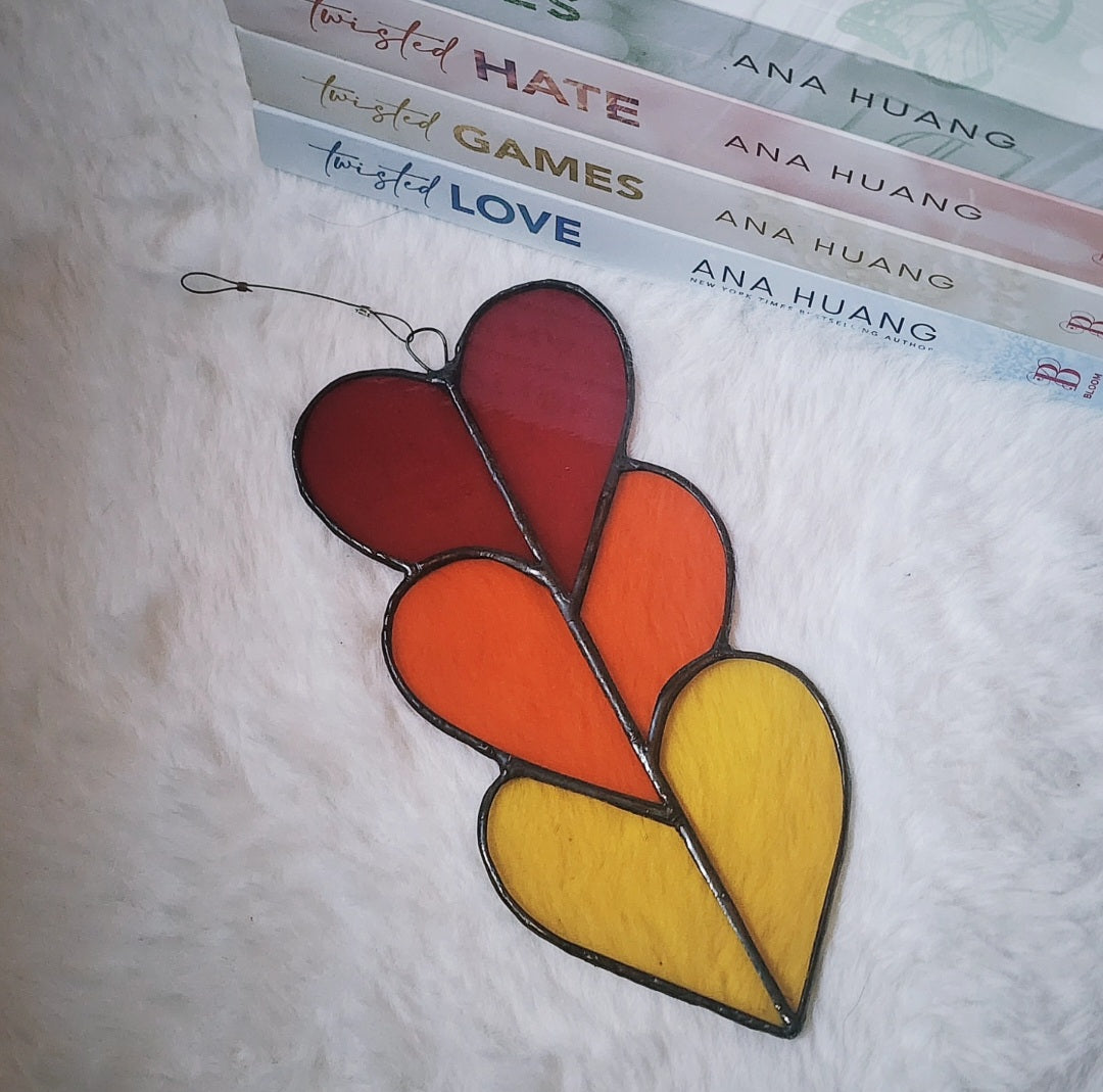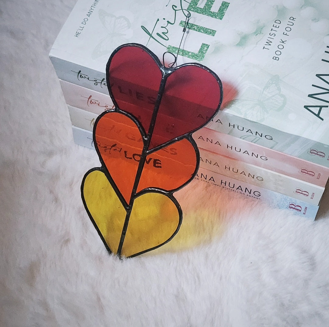 Made by Warrior Goddess Glass using warm colored (red, orange, and yellow) water glass that creates wavy heart refractions when the sun shines through it!